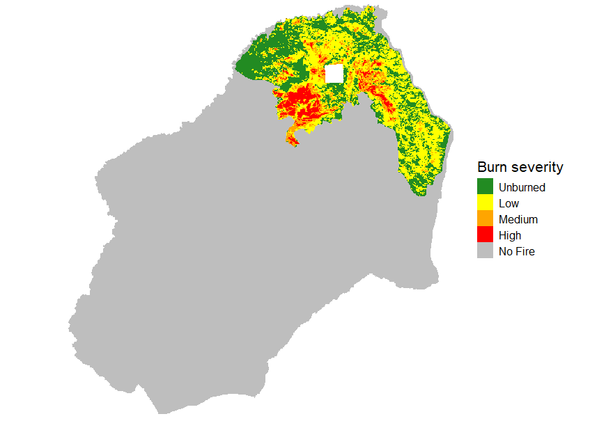 A snippet of R code and resulting plot assessing burn severity from composite satellite imagery