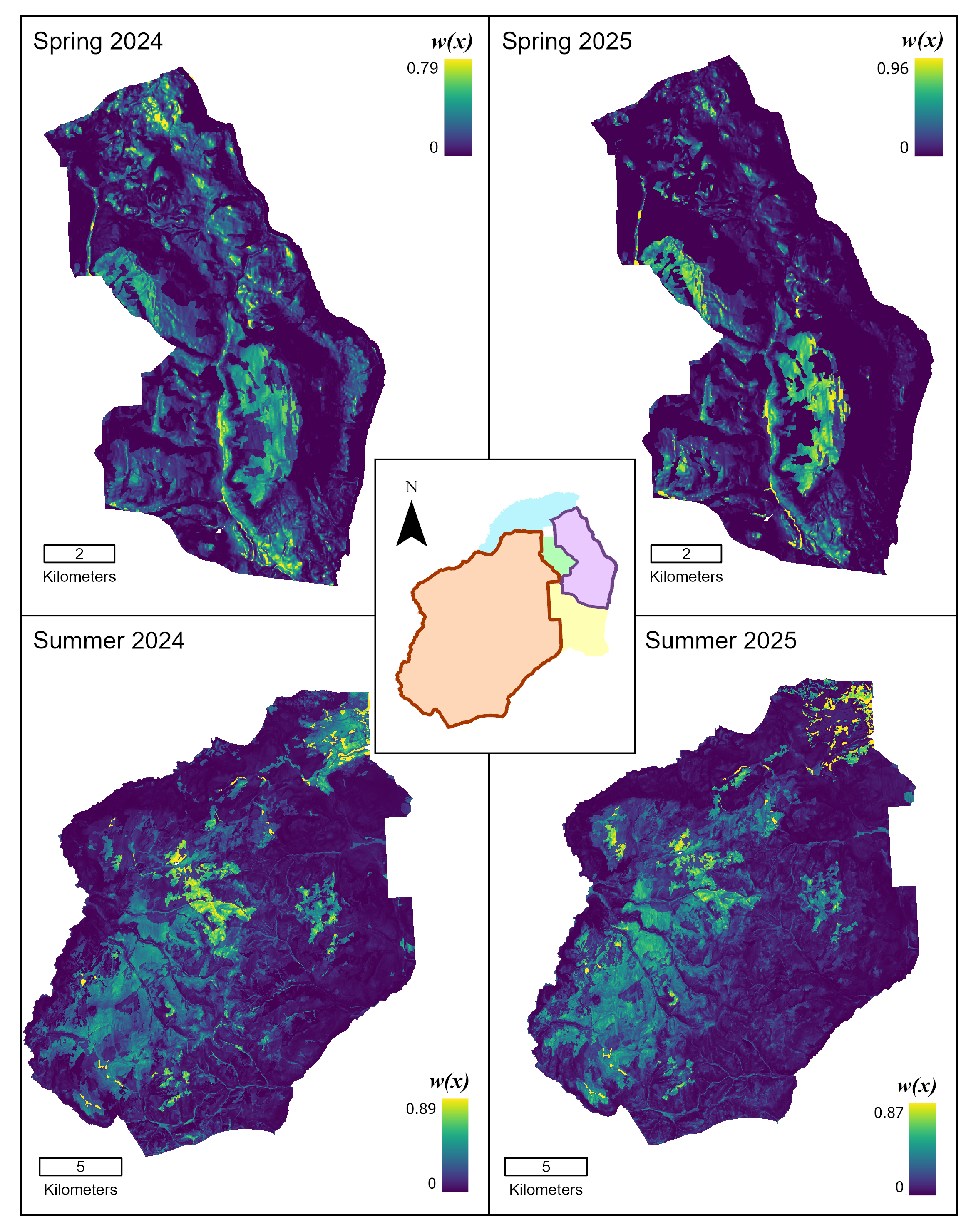 I’m currently working on an analysis of cattle GPS locations to investigate cattle utilization of tenure land in collaboration with the BC Ministry of Forests Range Branch. I’ve investigated correlations between observed cattle use and environmental variables and developed four models (Resource Selection Functions) to determine probability of use across the landscape in four different study periods.